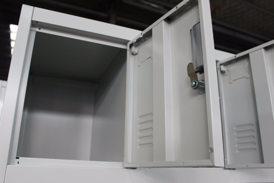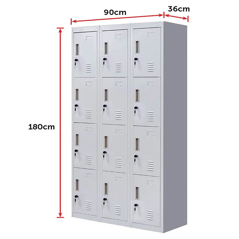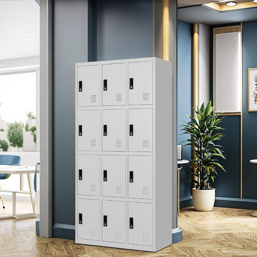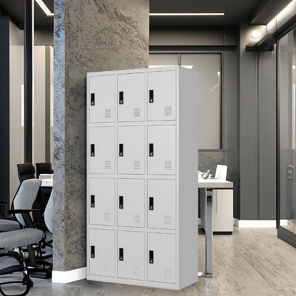 Each of the 12 lockers comes with its own lockable door, offering privacy and security for every user. This makes it ideal for staff rooms, institutions, and shared offices where personal storage is essential.