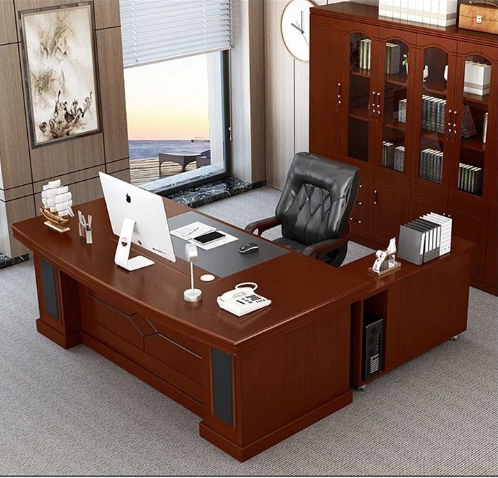The L-shaped layout provides extended workspace for computers, documents, and meetings, allowing executives to manage tasks efficiently. The dual-surface design helps organize work zones and improves overall workflow.