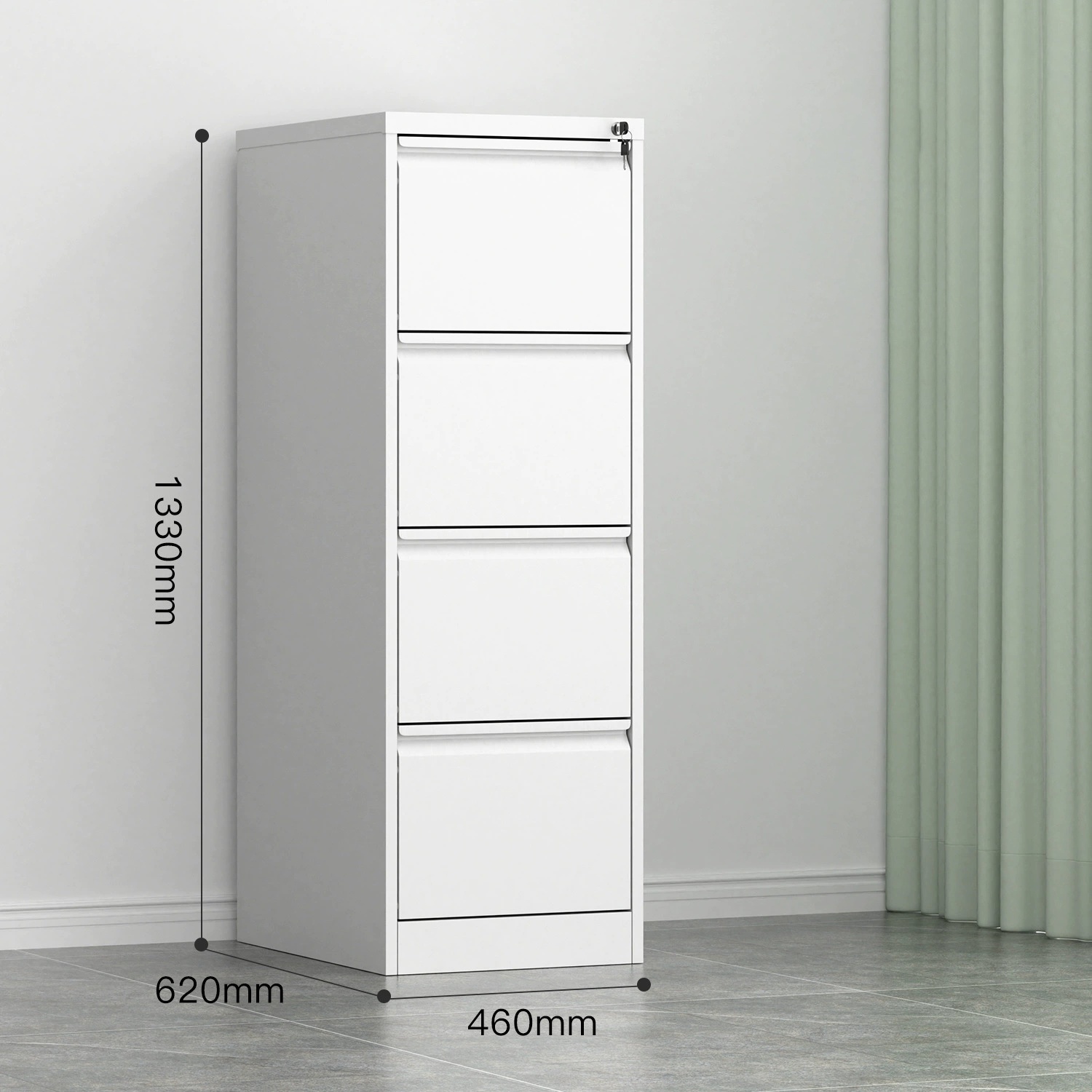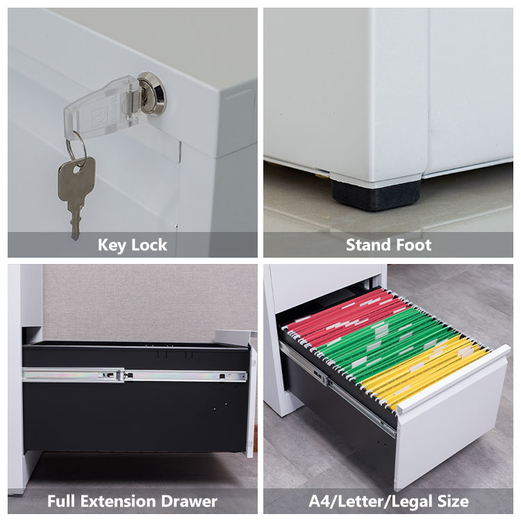 The cabinet features four full-sized drawers, offering generous space for documents, folders, and office supplies. Consequently, you can categorize files and personal items efficiently, reducing clutter and streamlining workflow. Moreover, having multiple drawers allows you to keep different types of items neatly separated for easy access.