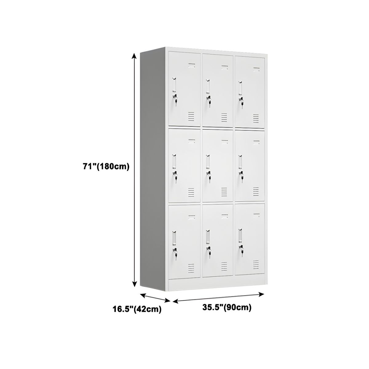 The cabinet features nine separate locker compartments. Consequently, each user gets secure, personal storage. The individual doors allow easy access and organization.